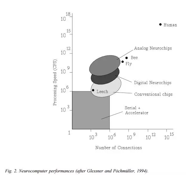 「未来十年,微电子很可能将继续主导神经网络实现的领域。如果进展和过去进步得一样快,那就意味着神经计算机的性能将会增长大约 2 个数量级。因此,神经计算机将会接近 TeraCPS(10^12 CPS)的性能。由 100 万个节点(每个节点有大约 1000 个输入)组成的网络可以达到大脑的计算速度(100-1000 Hz)。这将能为实验合理巨大的网络提供良好的机会。」