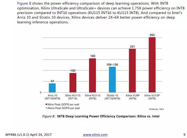 我对这种方法也有些兴趣。赛灵思和英特尔(收购了 Altera)的 FPGA 是很强大的引擎。赛灵思自然宣称他们的 FPGA 是对 INT8 最好的,他们的一份白皮书里面包含了下面的幻灯片: